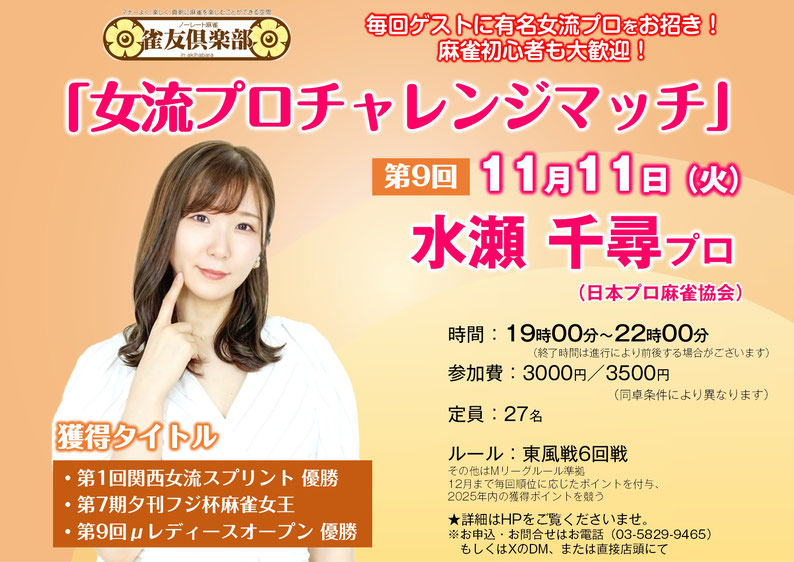 雀友倶楽部では、2025年3月より「女流プロチャレンジマッチ」を開催いたします。