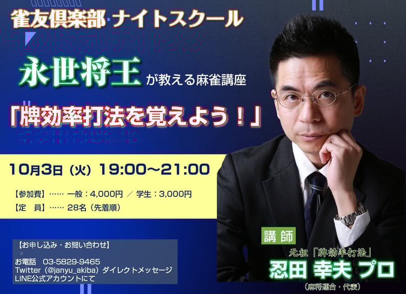 雀友倶楽部では、火曜日夜の新講座「雀友・ナイトスクール」を開催しております!