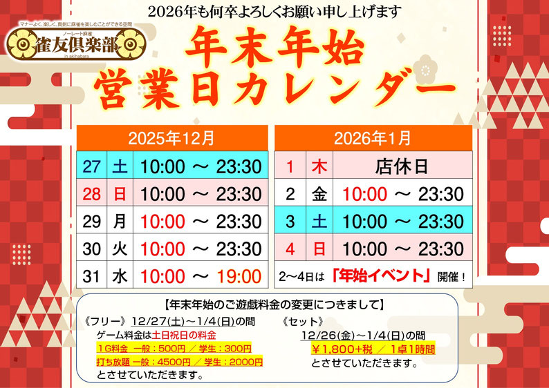 12月26日(金)~新年1月4日(日)のセット営業につきまして、